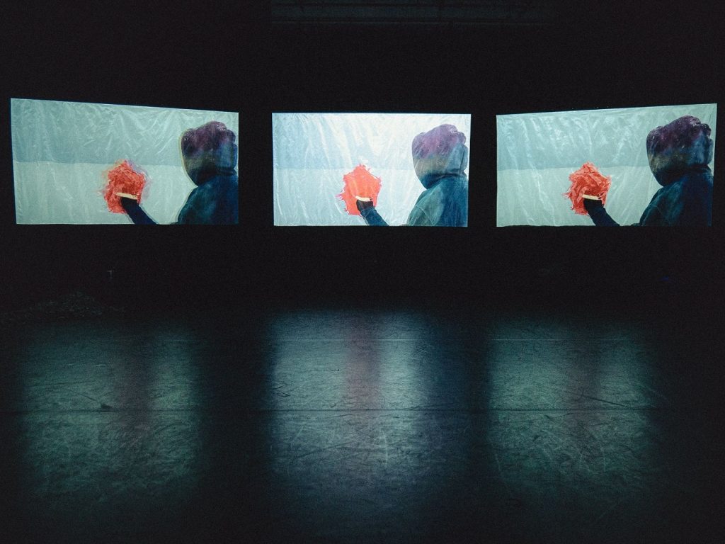 Projetadas em três ecrãs prateados, figuras mascaradas dançam numa praia desolada e coberta de neve. Situadas num futuro ambíguo e indefinido, os seus gestos espectrais — de cheerleading, de navegação e passos de ballet — surgem como vestígios de um mundo que chegou ao fim.