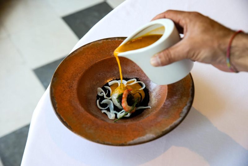 O menu destaca ingredientes sazonais e de proximidade, desde peixes e mariscos que chegam da costa portuguesa a legumes e cogumelos da época. A sopa de peixe reúne gamba do Algarve, peixe da lota e choco, finalizada com um crocante de milho e algas que lhe dá textura e frescura. O prato C. L. P. combina camarão, lavagante e pregado com uma sinfonia de abóbora e um creme de manteiga e ervas num equilíbrio preciso. O prato de carne recupera um clássico da casa, com o rabo de boi estufado de forma lenta para ganhar suavidade e profundidade de sabor, servido com cremoso de batata trufada, espinafres e um salteado de cogumelos que completa o conjunto.