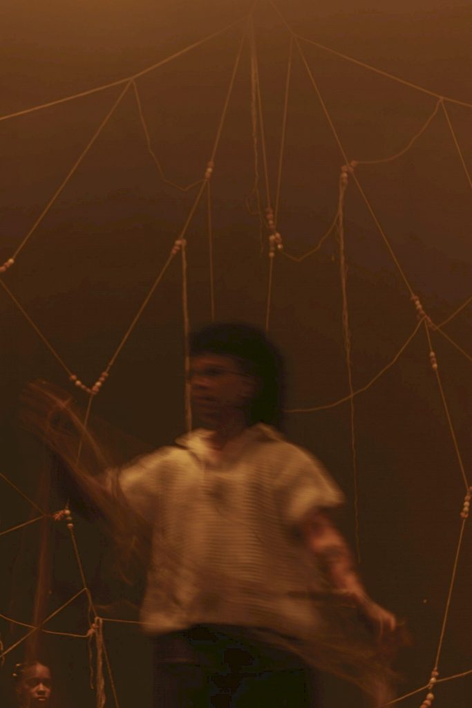 Em Pirarucu – Filho de peixe, peixe é, Mandí Kaibô tece no corpo vivo do barro, memórias e saberes ancestrais da sua vivência em comunidade e principalmente com a sua avó Joveniana Gomes da Silva, costureira e inventora de mundos imaginários, que lhe ensinou os primeiros e mais preciosos fundamentos de vida. Enquanto se transforma em peixe, entoa um gozo telúrico entre fios de corda e miçangas de barro que, em sua repetição, desmantelam a imposição do esquecimento colonial, fazendo emergir o indizível.